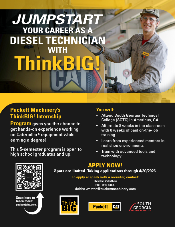 If you want a degree program that combines classroom learning with hands-on experience, ThinkBIG is for you. Through our partnership with South Georgia Technical College (SGTC), you’ll learn to service Caterpillar equipment using advanced technology and modern diagnostic tools—all while earning your Associate’s Degree.